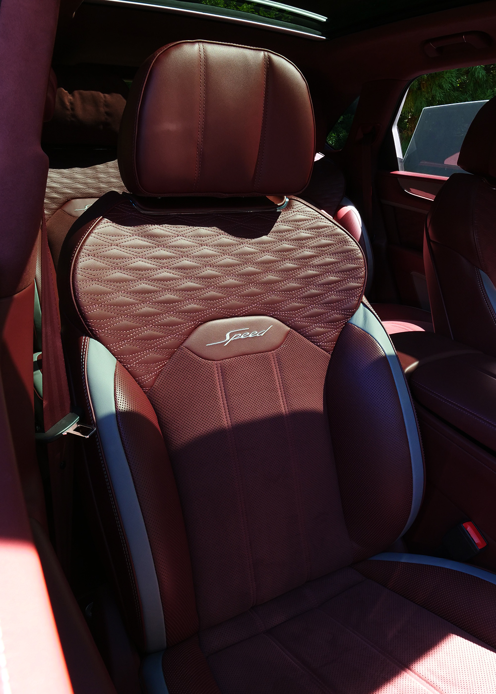 Inside, the craftsmanship is unmistakably Bentley — hand-finished hides, the new Precision Diamond quilting exclusive to the Speed, and a signature color split with contrast stitching and piping. Dark finish air vents and subtle driver-oriented details, like the custom display graphics, create an interior that’s both luxurious and quietly assertive.