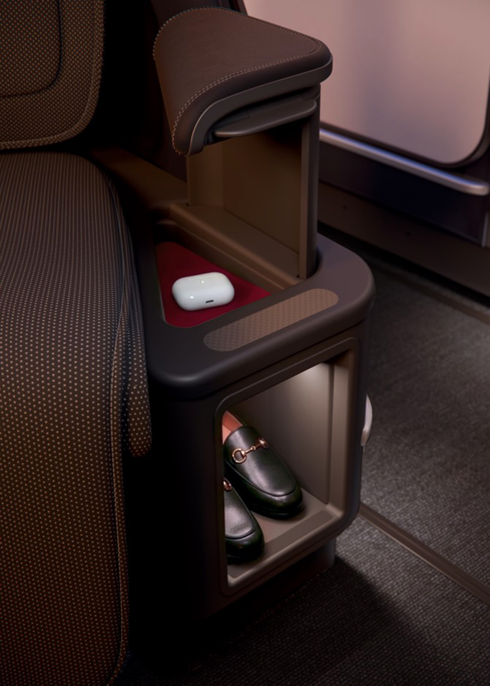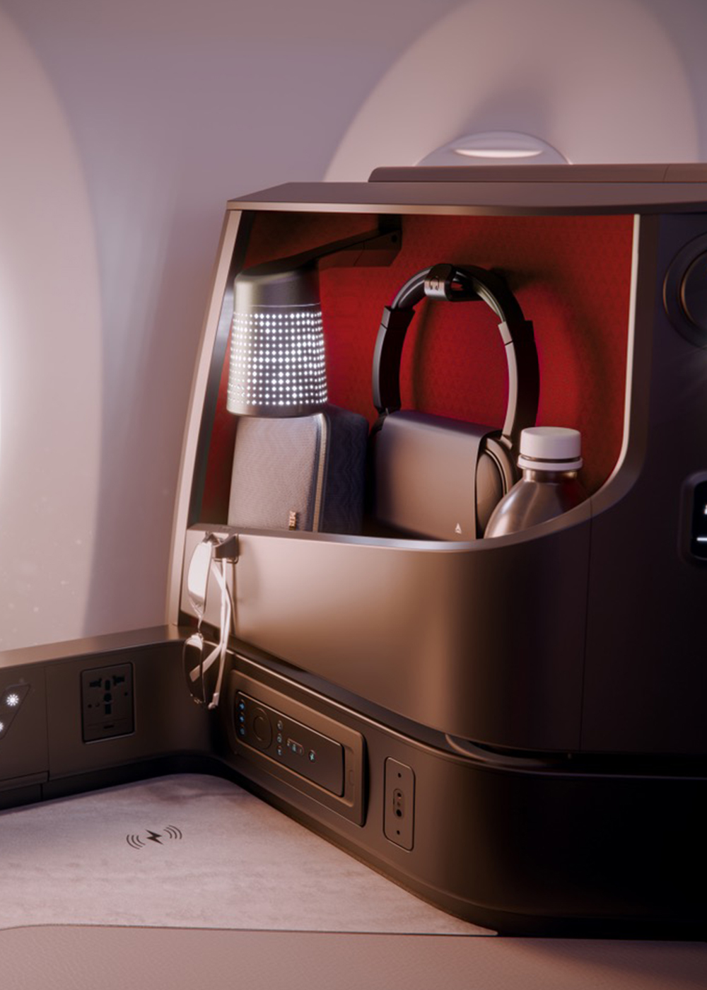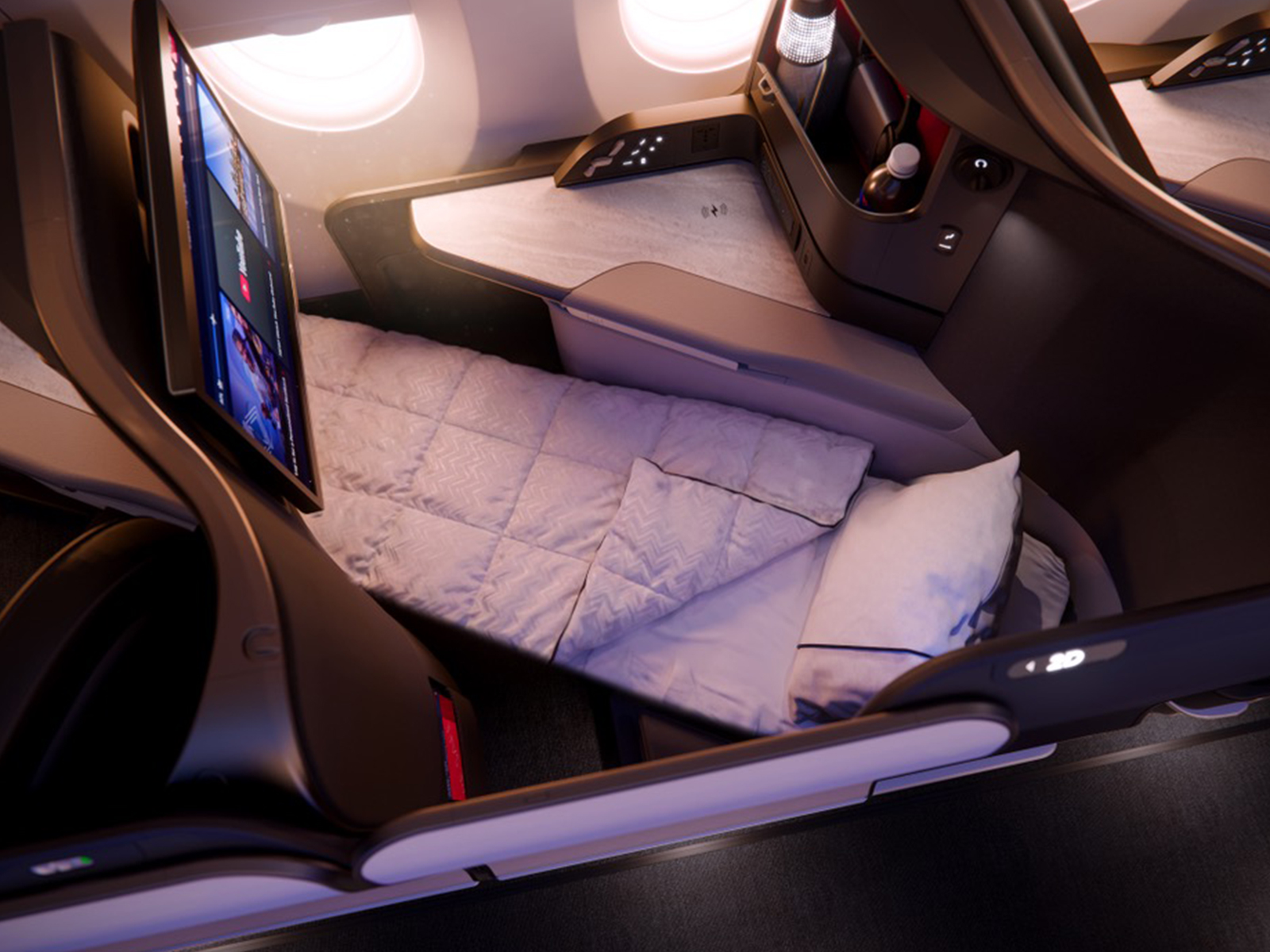 The suite itself is where things sharpen. Developed with Thompson Aero Seating and informed by years of passenger feedback, the design leans into precision rather than excess. A flat-bed now extends beyond six-and-a-half feet—longer, notably more accommodating. A pillow-top layer softens the memory foam base, introducing a level of comfort that feels closer to hospitality than aviation.