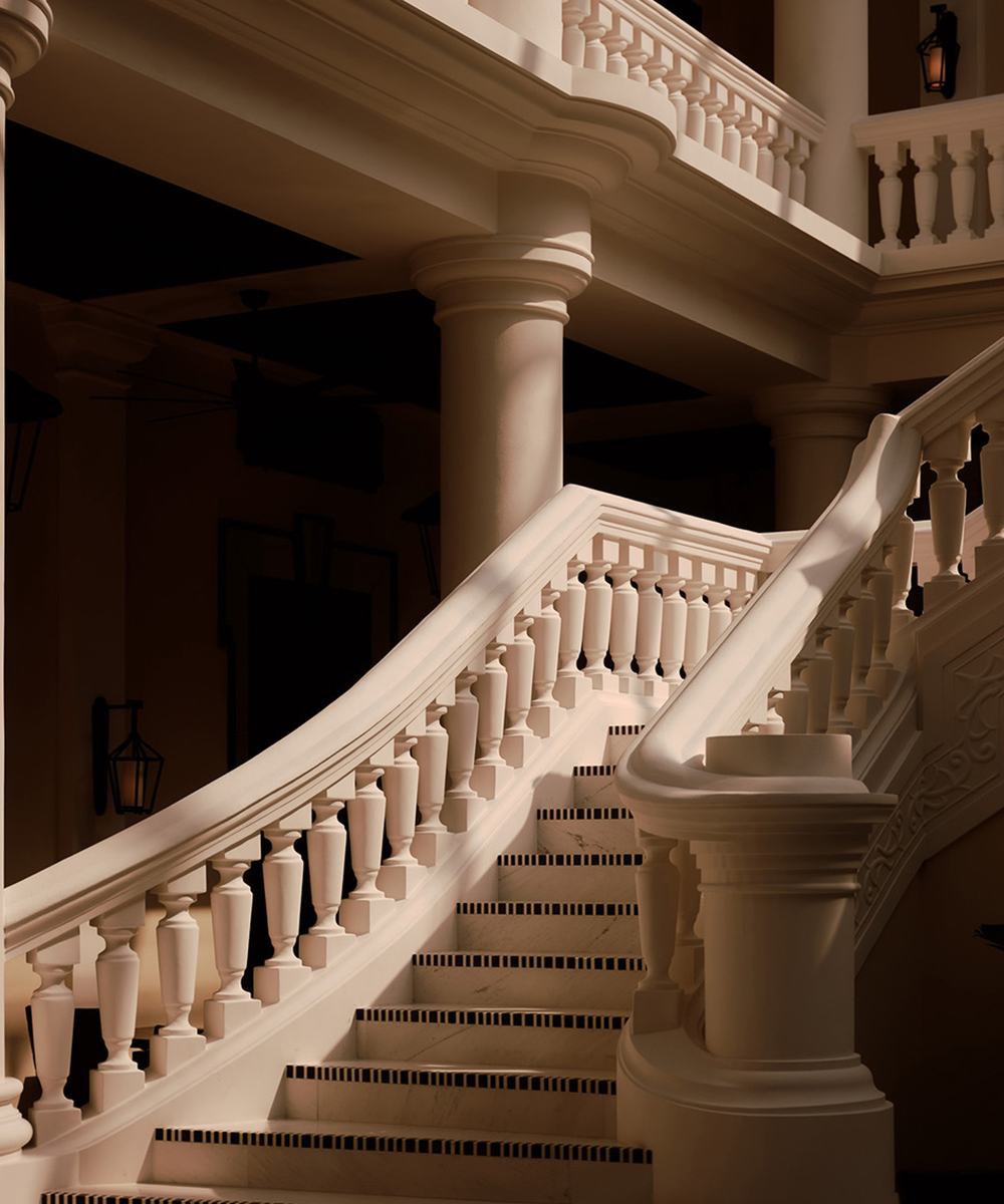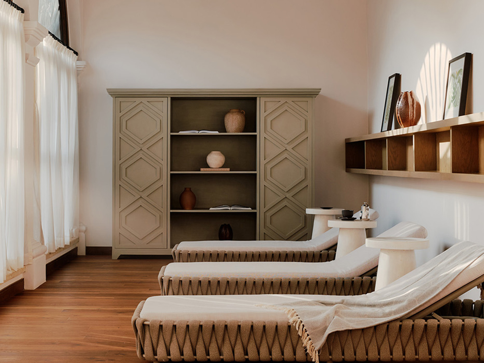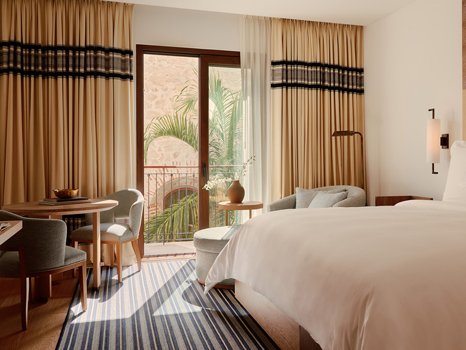 Inside, a soaring glass atrium and grand staircase introduce a sense of scale, but the experience quickly narrows into something more intimate. The 131 accommodations, including 27 rooms and suites within heritage structures, balance preservation with precision. Original architectural details remain intact, now paired with bespoke furnishings and handcrafted elements that echo Catroux’s sensibility—Spanish colonial character, refined rather than romanticized.