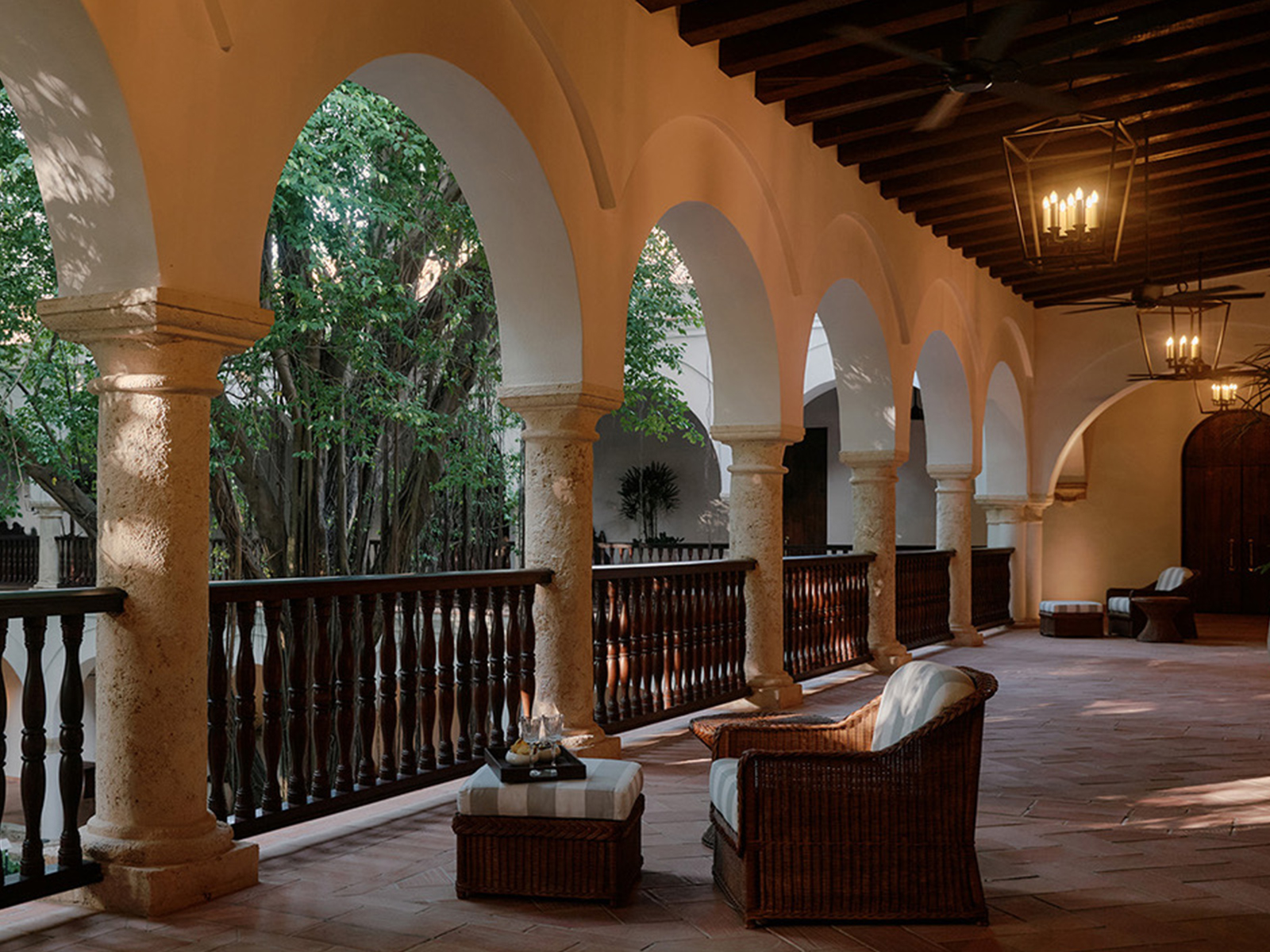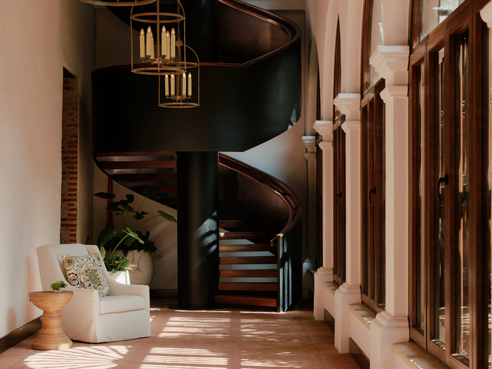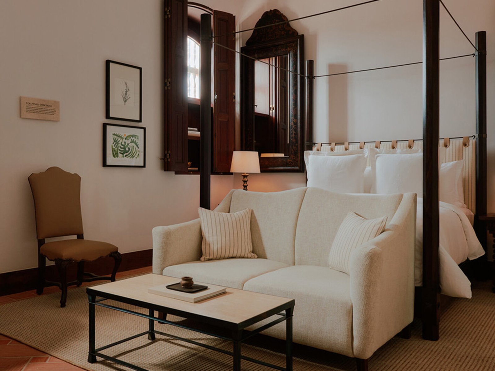 Elsewhere, contemporary rooms are reached through passageways and quiet courtyards—moments of transition that slow the experience. Interiors are pared back: soft tonal palettes, works by Miguel Cárdenas, sculptural interventions by Alejandro Hernández, and custom furnishings shaped by natural light rather than excess.