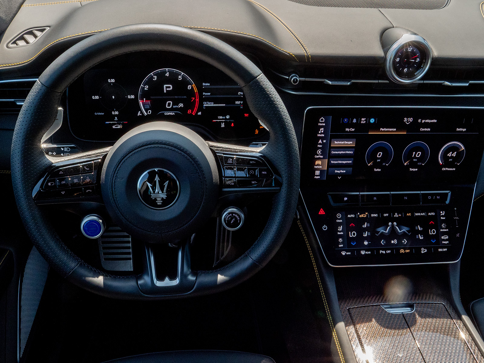 The cabin features two central displays—a 12.3-inch main touchscreen (the largest ever in a Maserati) and an 8.8-inch comfort display for climate and additional functions—alongside a digital instrument cluster and a beautifully reimagined digital clockface that can shift between classic and modern designs.