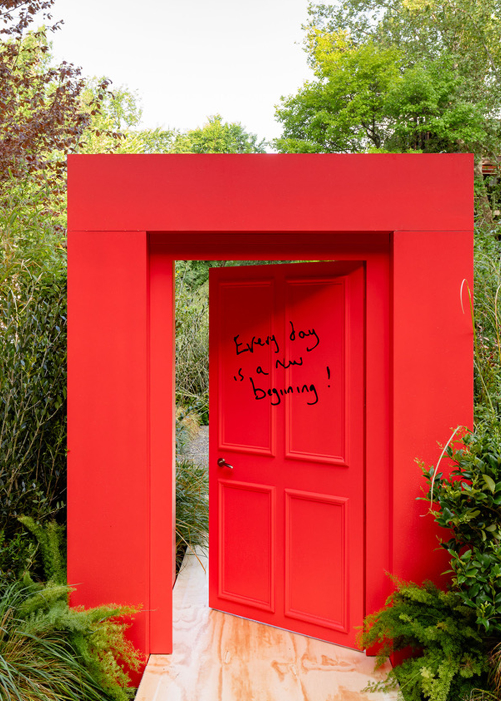 Visitors enter via a wooden footbridge, crossing into the courtyard and through a vivid red door—an intentional threshold that invites a shift in perception. Beyond it unfolds a constructed garden: pathways edged with grasses and plantings, leading to open platforms and geometric interventions. Throughout, Paul Smith’s Signature Stripe appears subtly, threading color through the environment without overwhelming it.