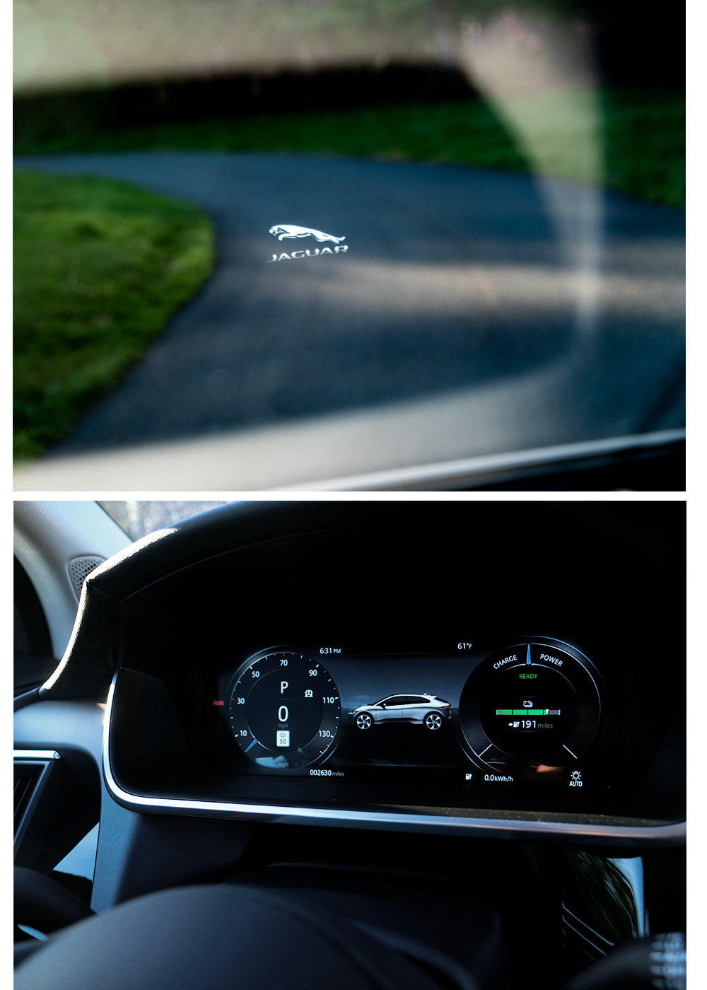 Outside the exterior design is enhanced with a new Atlas Grey grille tip finish. Complementing the Atlas Grey grille tip finish is the luxurious Bright Pack option, available on all models in the I-PACE range. The Bright Pack accentuates the breathtaking exterior design with a Noble Chrome grille surround, Atlas Grey door mirror caps, Satin Chrome window surrounds, and Atlas Grey for the rear diffuser. The contemporary Black Pack option is enhanced by applying the gloss black finish to the rear badges. A refreshed paint palette now features colors such as Aruba, Caldera Red, Portofino Blue, and our photo car in Eiger Grey.