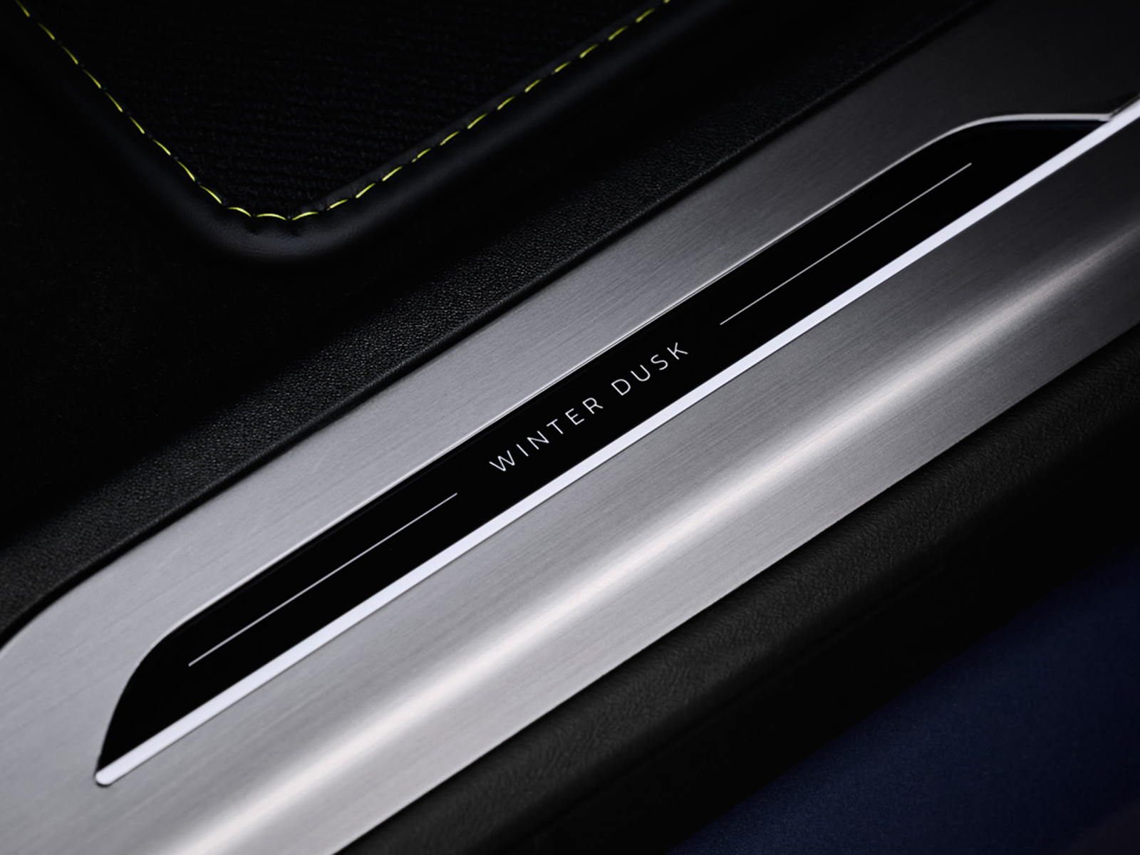 Inside, the cabin continues the theme with Ebony leather upholstery detailed with Nano Yellow stitching. Lightweight carpeting and Natural Black Birch finishers create a quietly technical interior environment, while bespoke Winter Dusk elements appear on the headrests, treadplates, and even the cup-holder topper.