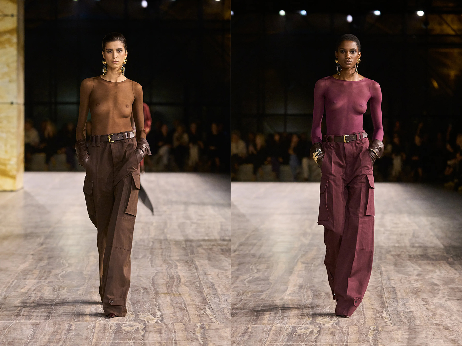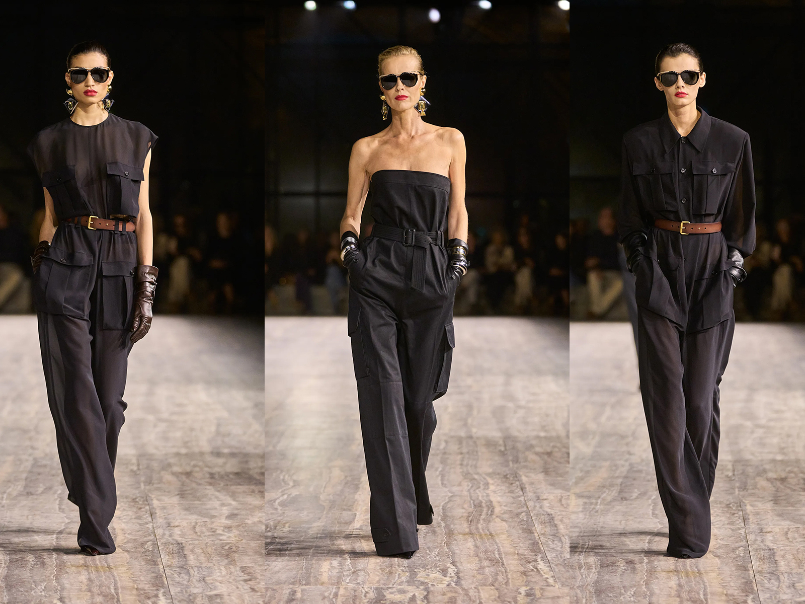 The Saint Laurent women graced the runway in sophisticated safari jackets paired with pleated trousers in rich earthy hues like burgundy, brown, and cream. Sheer tops added allure to their silhouettes, while classic untucked shirts and cargo-style dresses added a timeless touch. Each ensemble, unified in its monotone palette, exuded an exclusive air reminiscent of YSL’s iconic style, infused with an undeniable sense of chic sophistication by Vaccarello.