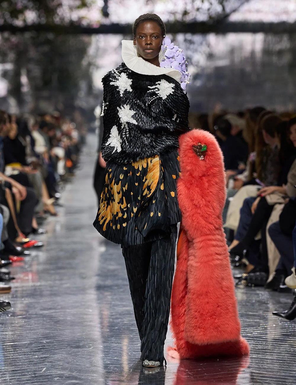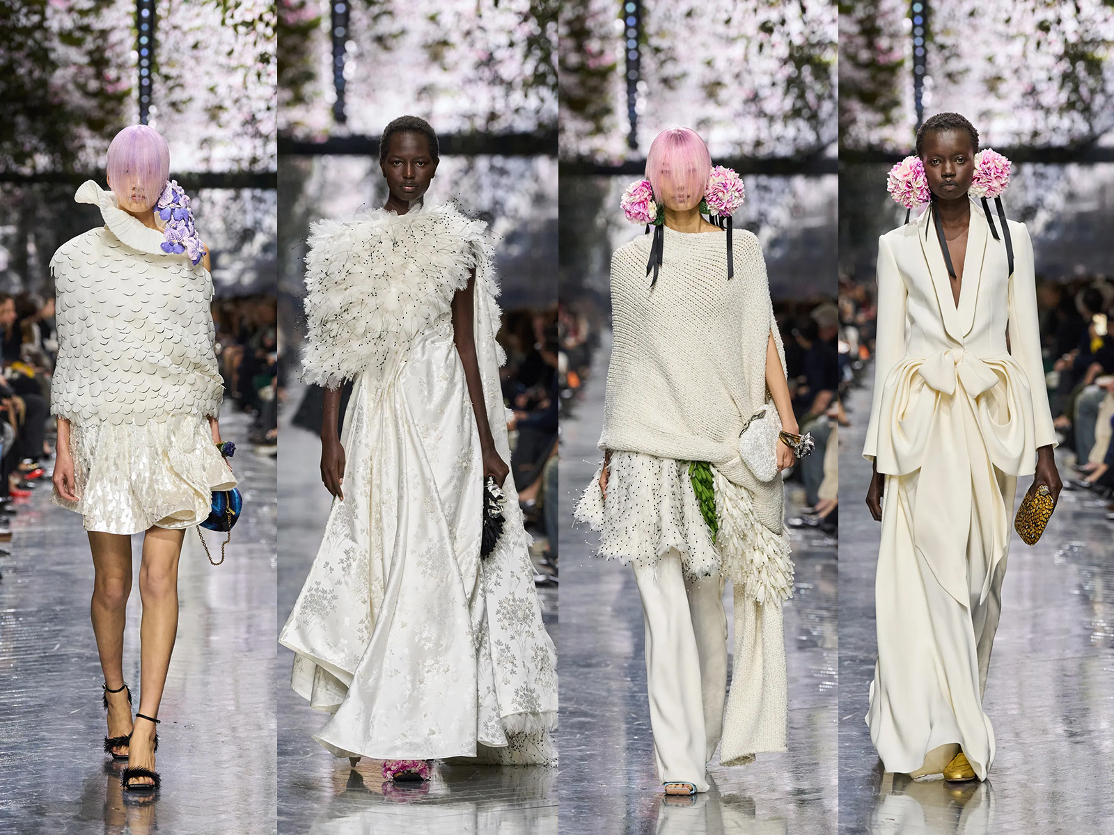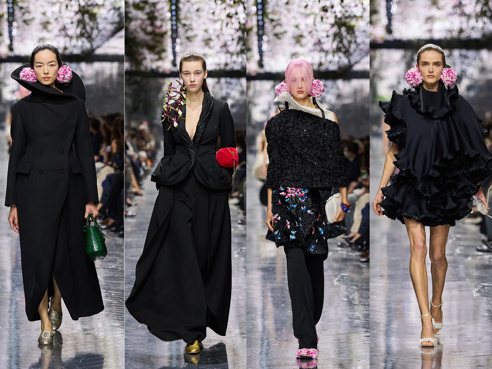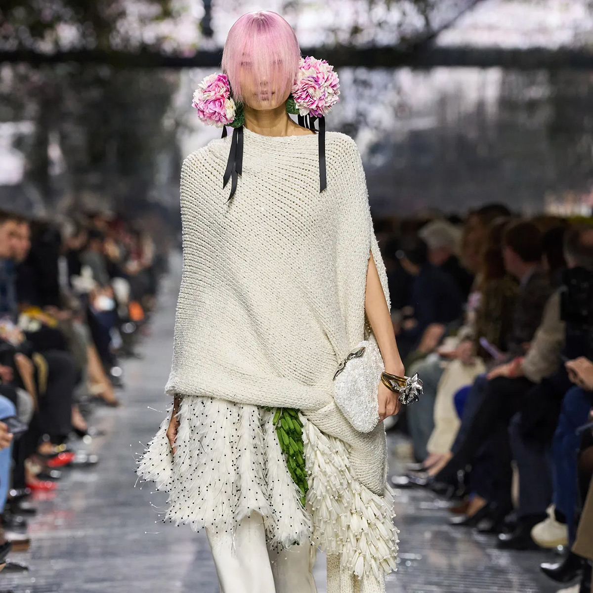 Flowers, long central to the Dior mythos, appeared not as surface decoration but as sculptural punctuation. Monsieur Dior’s devotion to gardening has often been rendered through embroidery or print; Anderson instead made florals tactile and strange. Snowball-sized earmuffs of cyclamen framed the face, inspired by a bouquet John Galliano once brought to the atelier—a quiet nod to lineage without nostalgia. Elsewhere, petals appeared abstracted, enlarged, or implied through texture rather than illustration. The effect was less romantic than curious, asking the viewer to reconsider what floral femininity might mean now.