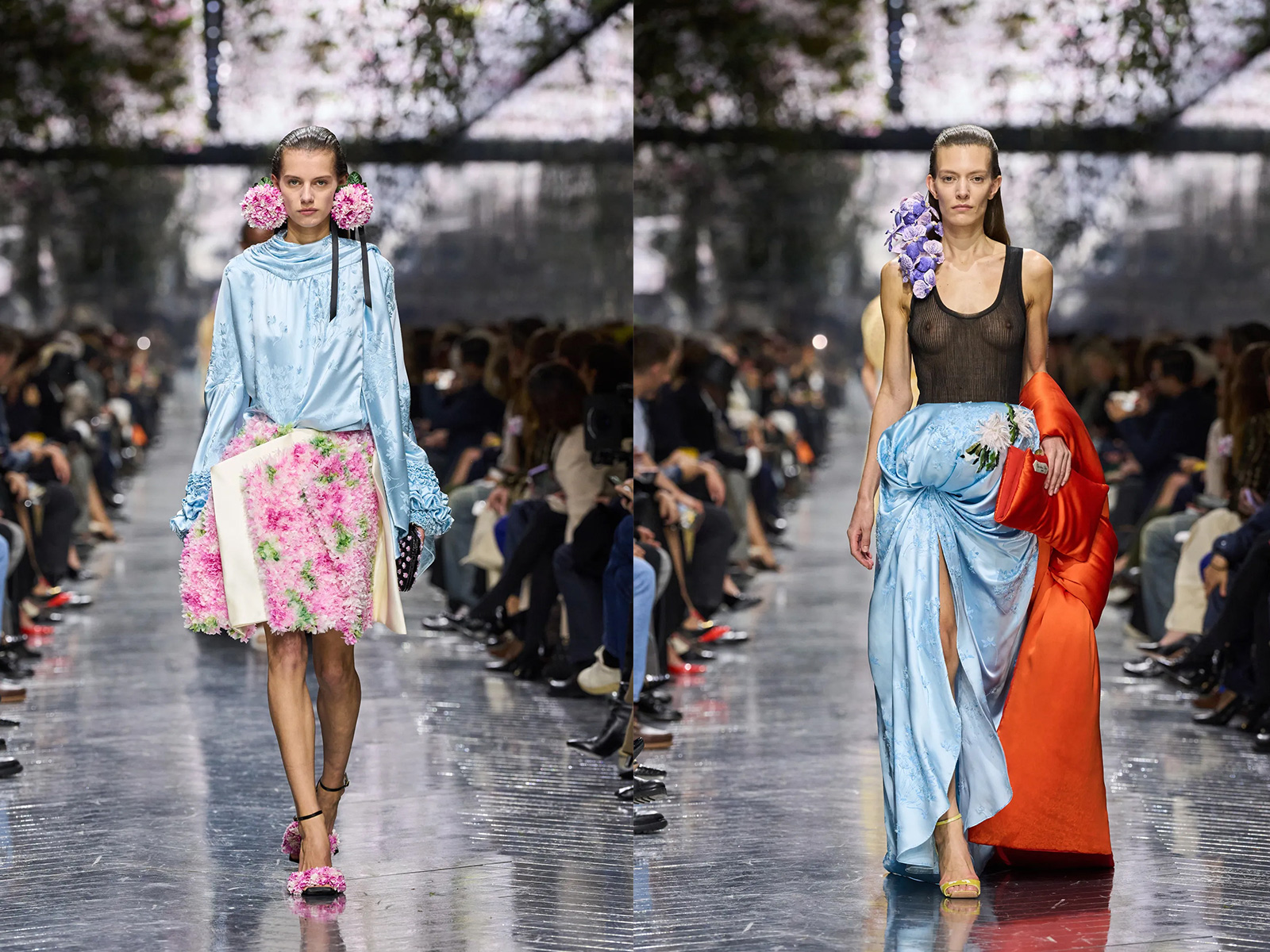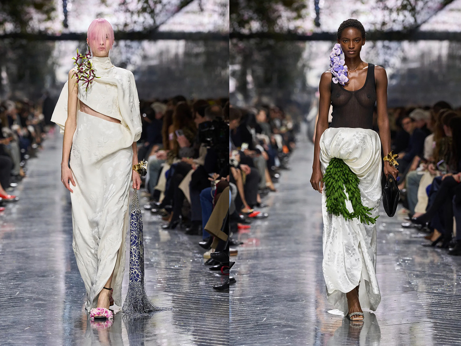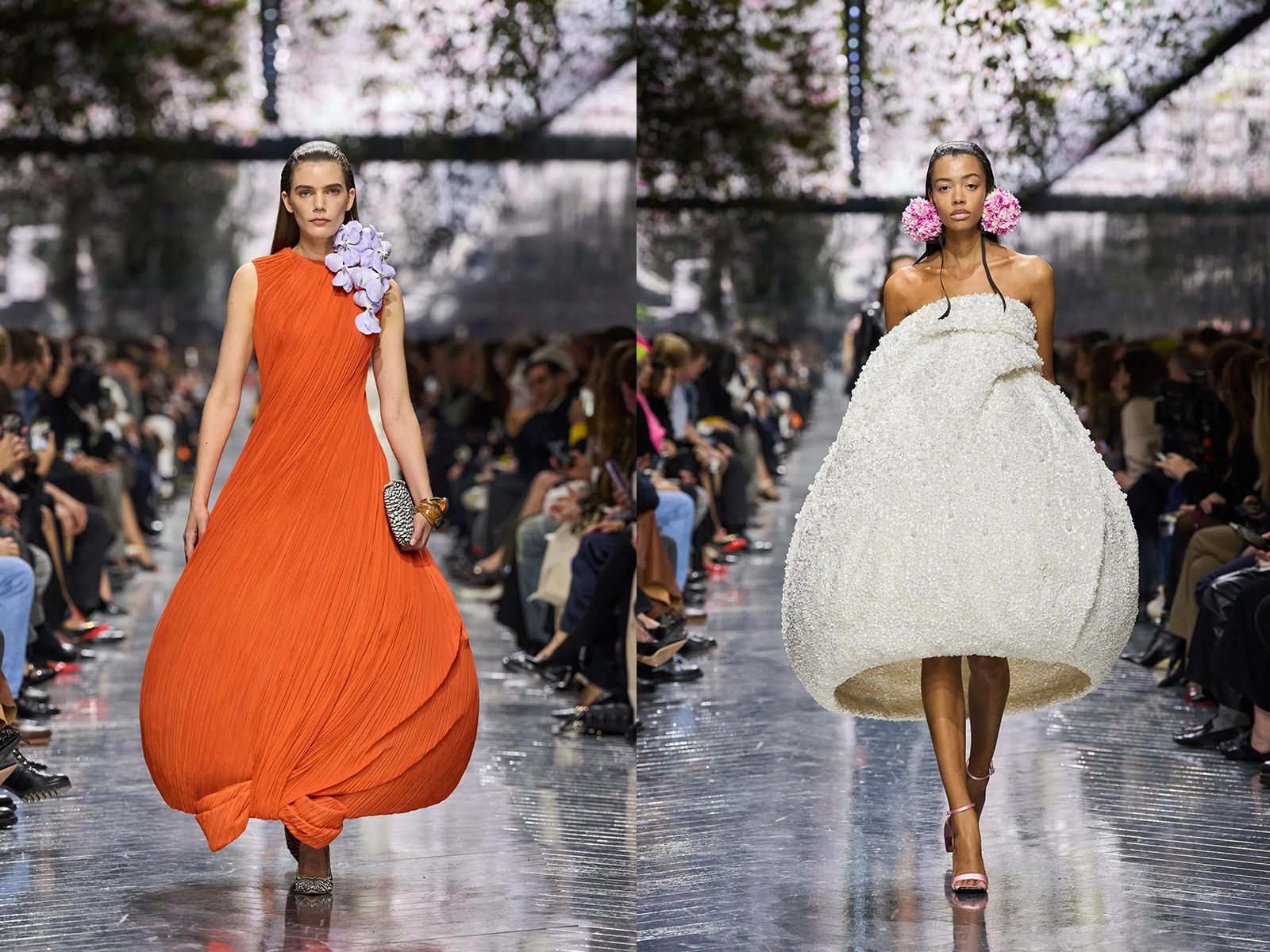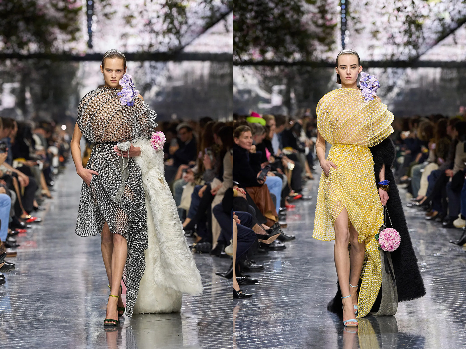 Flowers, long central to the Dior mythos, appeared not as surface decoration but as sculptural punctuation. Monsieur Dior’s devotion to gardening has often been rendered through embroidery or print; Anderson instead made florals tactile and strange. Snowball-sized earmuffs of cyclamen framed the face, inspired by a bouquet John Galliano once brought to the atelier—a quiet nod to lineage without nostalgia. Elsewhere, petals appeared abstracted, enlarged, or implied through texture rather than illustration. The effect was less romantic than curious, asking the viewer to reconsider what floral femininity might mean now.