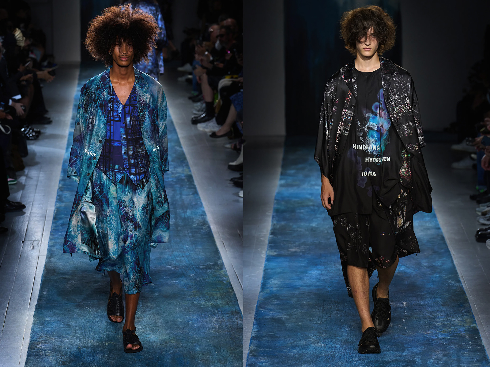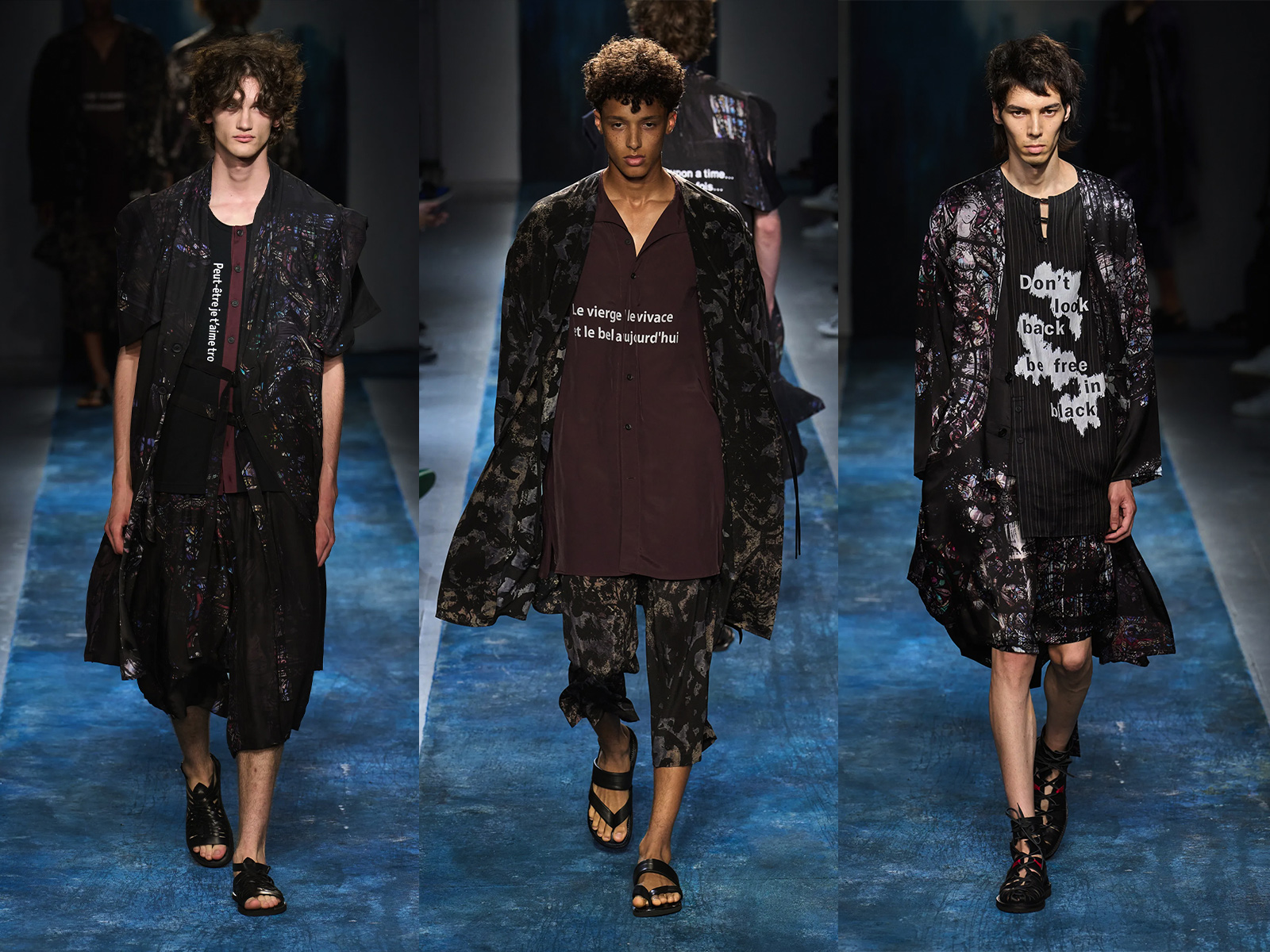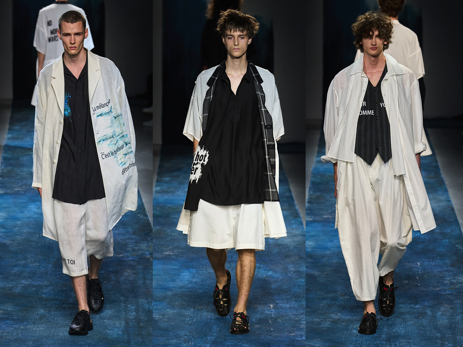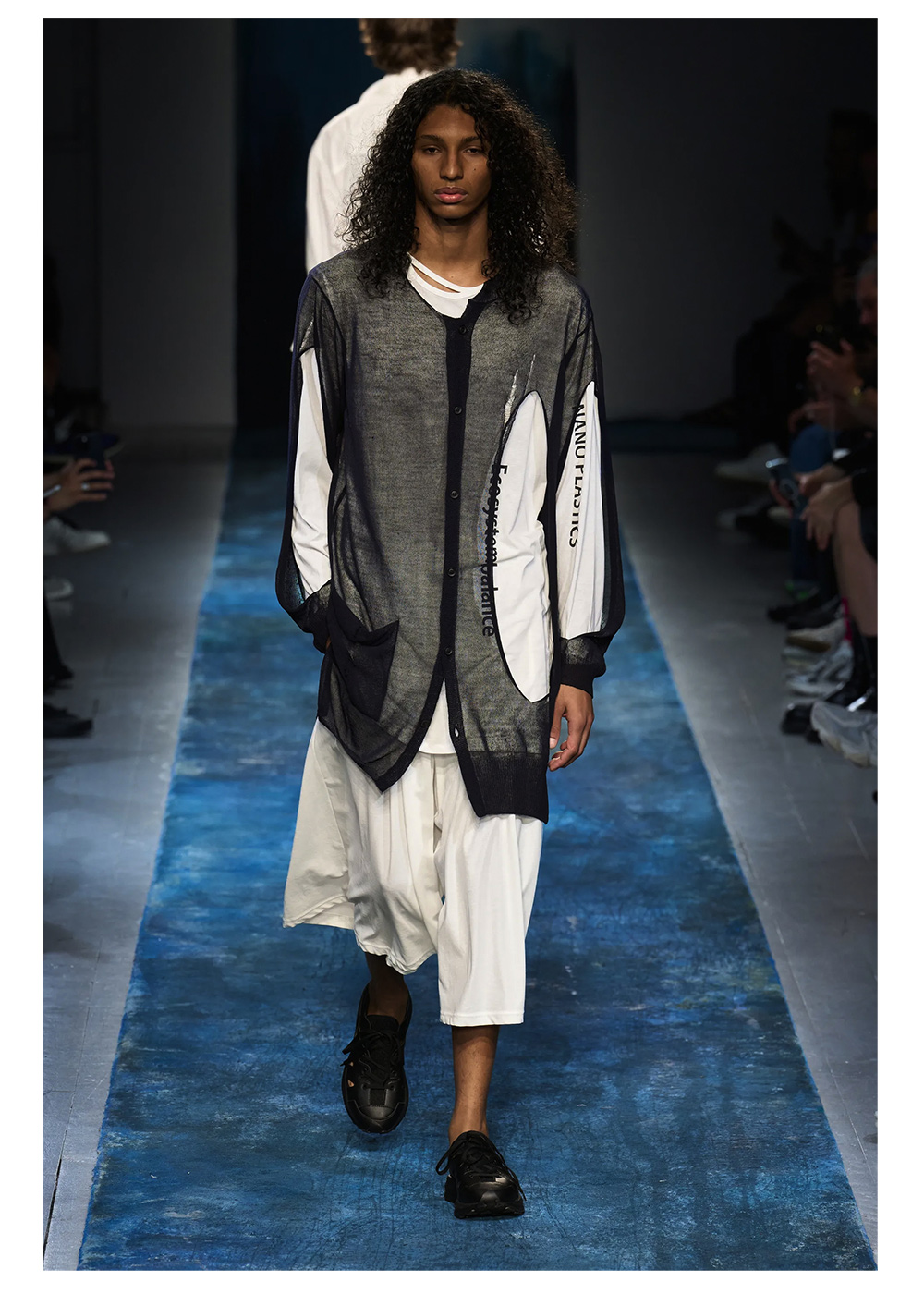 The writing printed across shirts and surfaces reads less like decoration and more like residue—phrases half-seen, messages not quite hidden but not performative either. They resist clarity, suggesting thought rather than slogan. In a season where fashion often spells everything out, Yamamoto allows ambiguity to linger. The words feel like notes left behind, warnings or observations that may only make sense later.